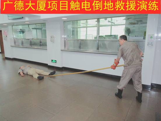 演練模擬施工過程中,作業(yè)人員搭建臨時(shí)用電線路時(shí)不慎觸碰接頭裸露部位,導(dǎo)致被電擊失去意識(shí)癱倒在地的場(chǎng)景。同班監(jiān)護(hù)人員見狀立即向廣德大廈管理處報(bào)告,觸電救援預(yù)案迅速啟動(dòng),救援組穿戴好絕緣護(hù)具后趕赴現(xiàn)場(chǎng),利用絕緣棍將觸電者與電源分離,現(xiàn)場(chǎng)控制組同時(shí)封鎖現(xiàn)場(chǎng),勸離無關(guān)人員,引導(dǎo)救援醫(yī)護(hù)入場(chǎng)。
